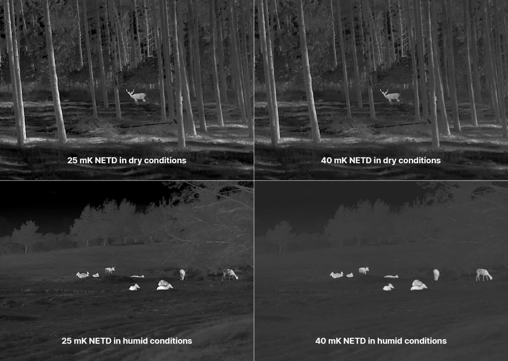 Recently, you may have started seeing more and more NETD ratings of 40, 35, 25, and 18 mK, with the lower NETD models more proudly advertised. It is worth remembering, when deciding on which device to buy, that these differences are mostly visible in humid conditions. When the weather is dry and clear, the difference between a device with a 35mK NETD value and one with a 25mK NETD value will most likely be quite hard to discern — in these conditions, spatial resolution is more important.